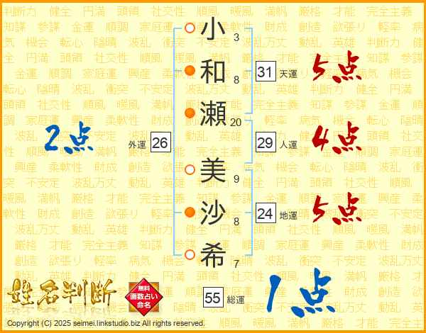 小(3画)和(8画)瀬(20画) 美(9画)沙(8画)希(7画)