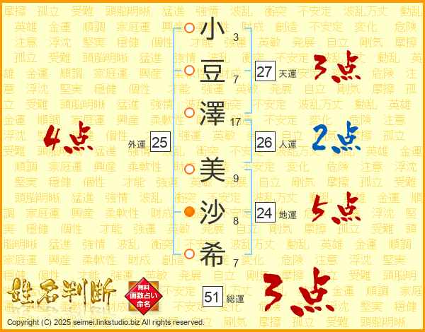 小(3画)豆(7画)澤(17画) 美(9画)沙(8画)希(7画)