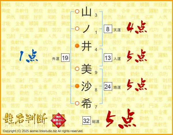 山(3画)ノ(1画)井(4画) 美(9画)沙(8画)希(7画)