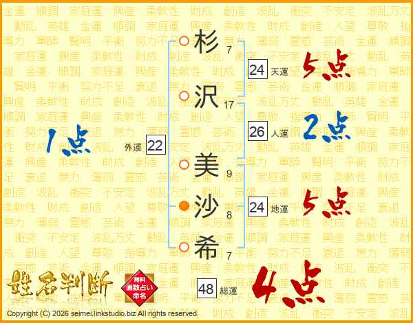 杉(7画)沢(17画) 美(9画)沙(8画)希(7画)