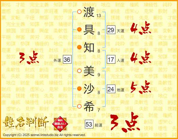 渡(13画)具(8画)知(8画) 美(9画)沙(8画)希(7画)
