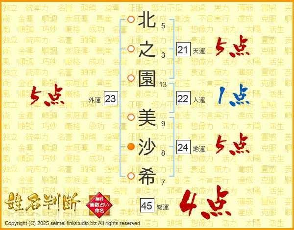 北(5画)之(3画)園(13画) 美(9画)沙(8画)希(7画)