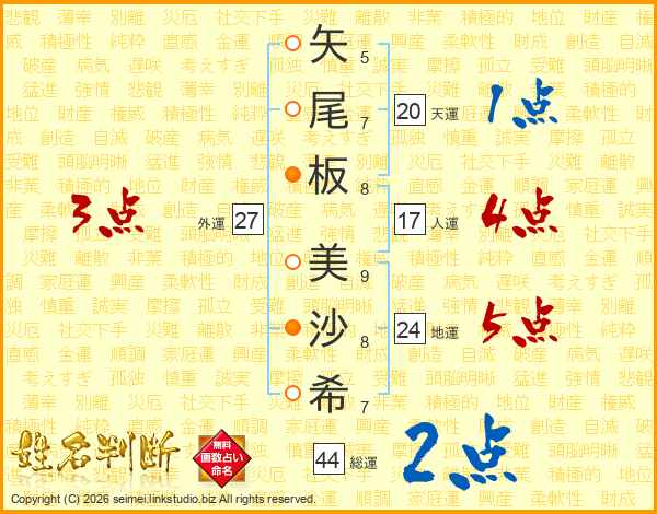 矢(5画)尾(7画)板(8画) 美(9画)沙(8画)希(7画)