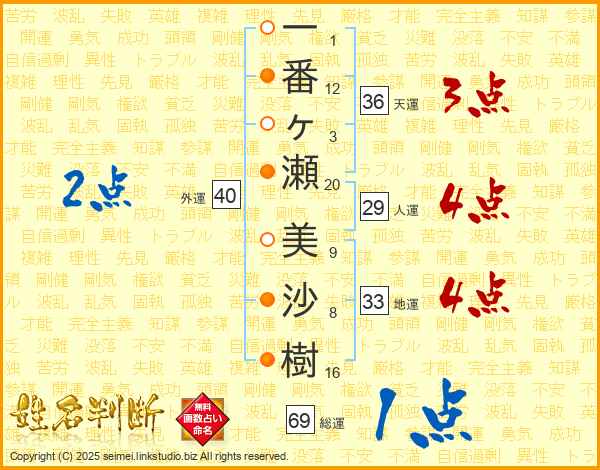 一(1画)番(12画)ヶ(3画)瀬(20画) 美(9画)沙(8画)樹(16画)
