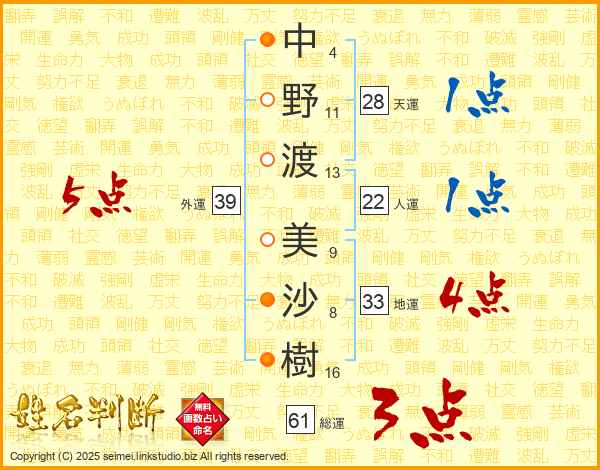 中(4画)野(11画)渡(13画) 美(9画)沙(8画)樹(16画)