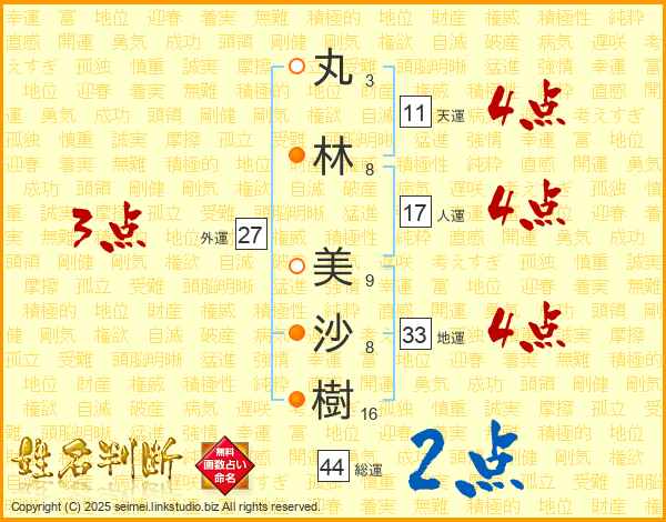 丸(3画)林(8画) 美(9画)沙(8画)樹(16画)
