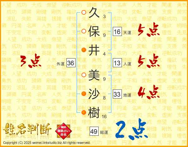 久(3画)保(9画)井(4画) 美(9画)沙(8画)樹(16画)
