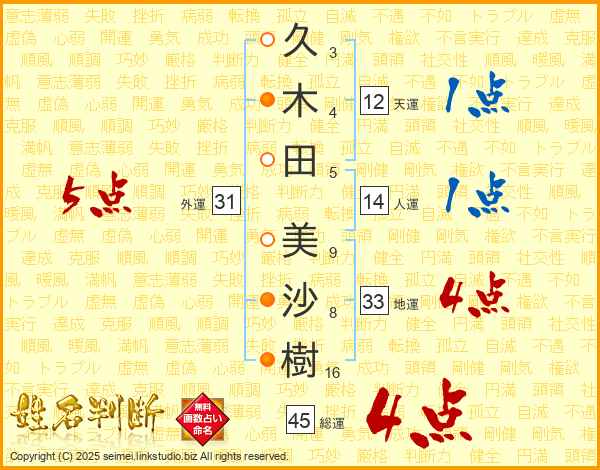 久(3画)木(4画)田(5画) 美(9画)沙(8画)樹(16画)