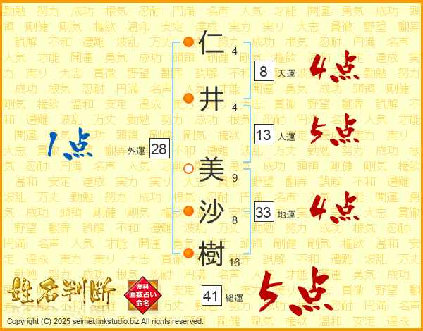 仁(4画)井(4画) 美(9画)沙(8画)樹(16画)