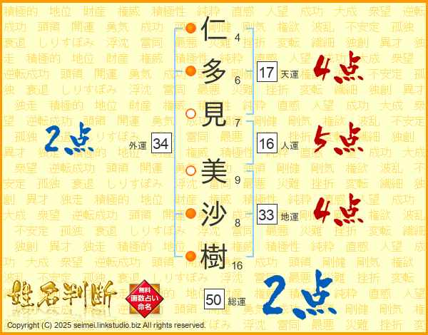 仁(4画)多(6画)見(7画) 美(9画)沙(8画)樹(16画)