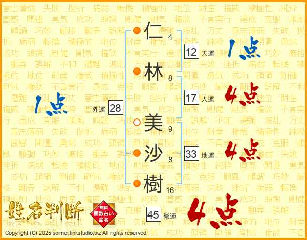 仁(4画)林(8画) 美(9画)沙(8画)樹(16画)