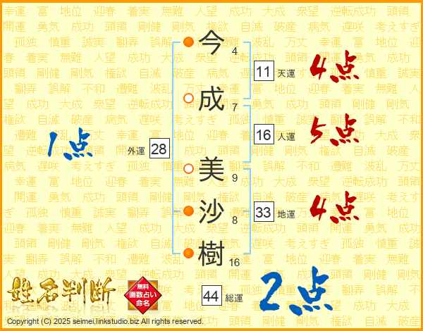 今(4画)成(7画) 美(9画)沙(8画)樹(16画)