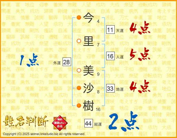 今(4画)里(7画) 美(9画)沙(8画)樹(16画)