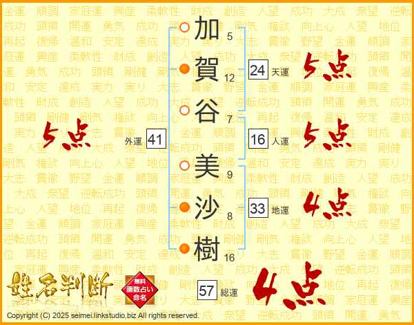 加(5画)賀(12画)谷(7画) 美(9画)沙(8画)樹(16画)