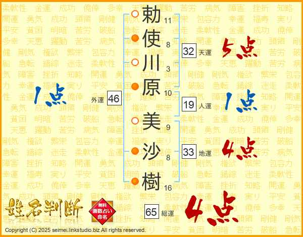 勅使川原美沙樹さんの総運は65画の4点!