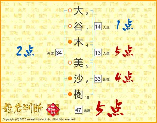 大(3画)谷(7画)木(4画) 美(9画)沙(8画)樹(16画)