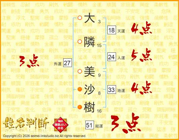 大(3画)隣(15画) 美(9画)沙(8画)樹(16画)
