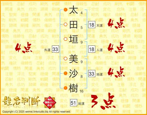 太(4画)田(5画)垣(9画) 美(9画)沙(8画)樹(16画)