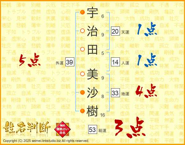 宇(6画)治(9画)田(5画) 美(9画)沙(8画)樹(16画)