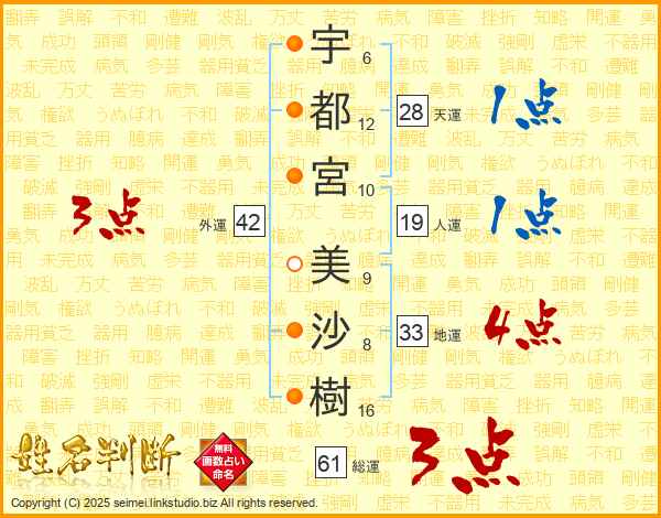 宇(6画)都(12画)宮(10画) 美(9画)沙(8画)樹(16画)
