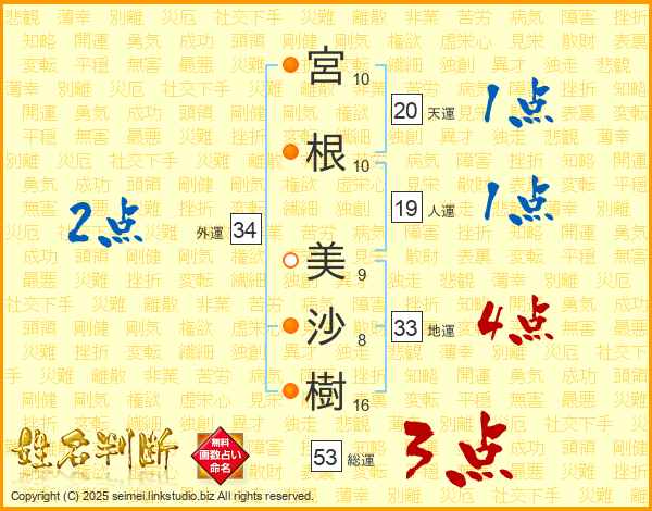 宮(10画)根(10画) 美(9画)沙(8画)樹(16画)
