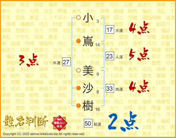 小(3画)嶌(14画) 美(9画)沙(8画)樹(16画)