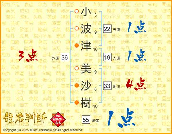 小(3画)波(9画)津(10画) 美(9画)沙(8画)樹(16画)