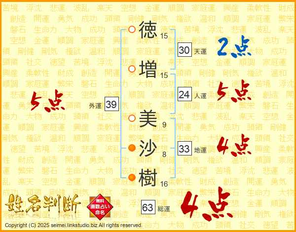 徳(15画)増(15画) 美(9画)沙(8画)樹(16画)