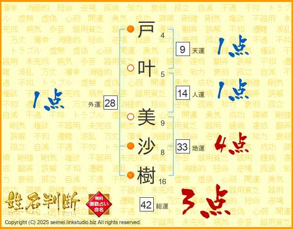 戸(4画)叶(5画) 美(9画)沙(8画)樹(16画)