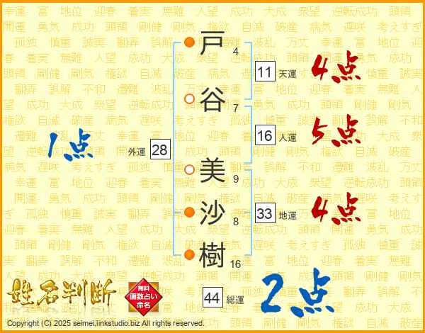 戸(4画)谷(7画) 美(9画)沙(8画)樹(16画)