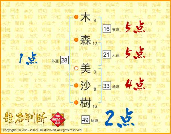 木(4画)森(12画) 美(9画)沙(8画)樹(16画)