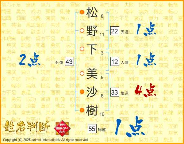 松(8画)野(11画)下(3画) 美(9画)沙(8画)樹(16画)