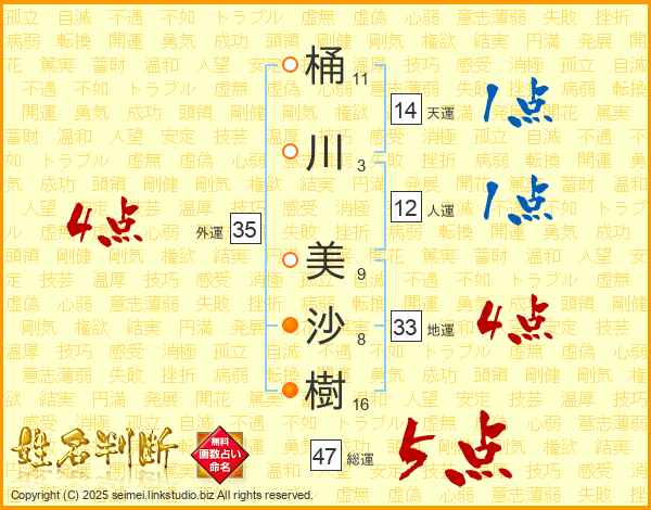 桶(11画)川(3画) 美(9画)沙(8画)樹(16画)