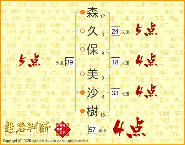 森(12画)久(3画)保(9画) 美(9画)沙(8画)樹(16画)