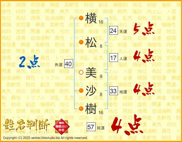 横(16画)松(8画) 美(9画)沙(8画)樹(16画)