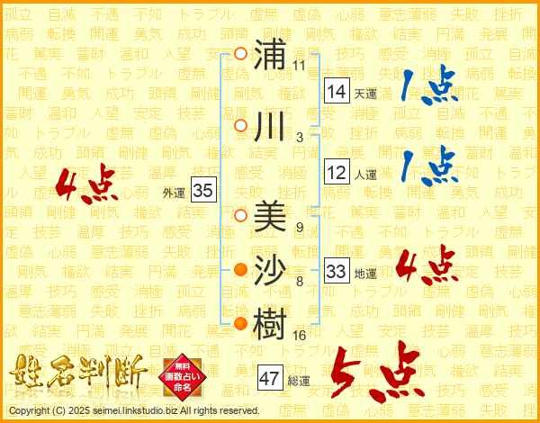 浦(11画)川(3画) 美(9画)沙(8画)樹(16画)