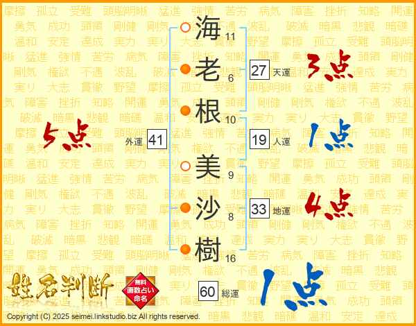 海(11画)老(6画)根(10画) 美(9画)沙(8画)樹(16画)