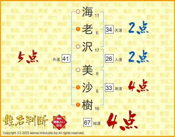 海(11画)老(6画)沢(17画) 美(9画)沙(8画)樹(16画)