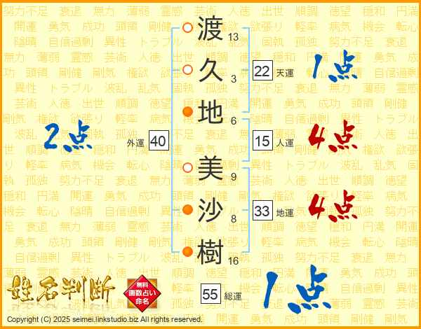 渡(13画)久(3画)地(6画) 美(9画)沙(8画)樹(16画)