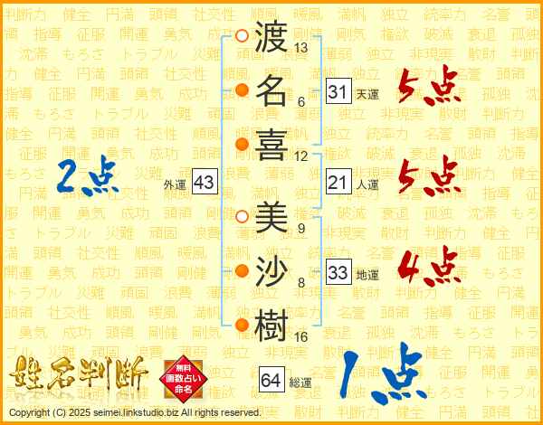 渡(13画)名(6画)喜(12画) 美(9画)沙(8画)樹(16画)