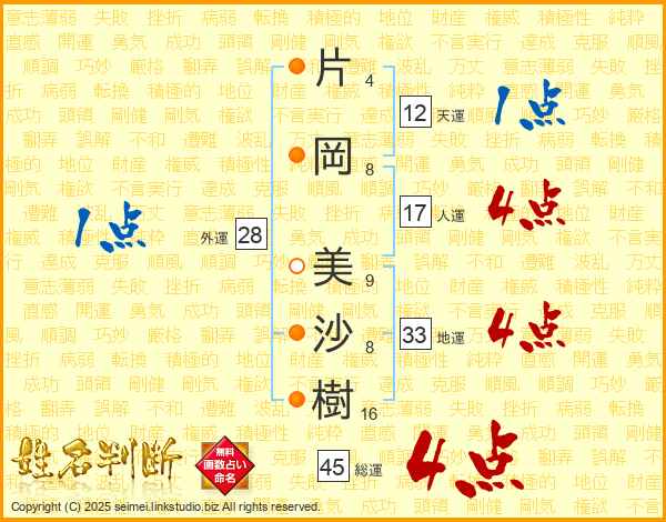 片(4画)岡(8画) 美(9画)沙(8画)樹(16画)
