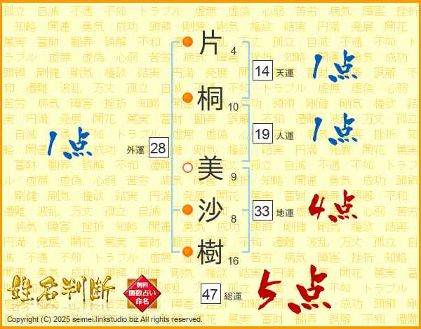 片(4画)桐(10画) 美(9画)沙(8画)樹(16画)