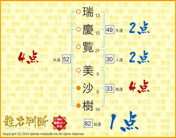 瑞(13画)慶(15画)覧(21画) 美(9画)沙(8画)樹(16画)