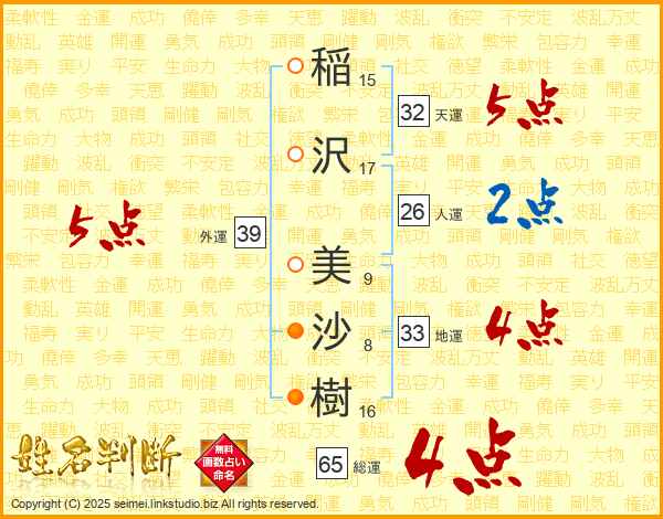 稲(15画)沢(17画) 美(9画)沙(8画)樹(16画)