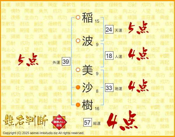 稲(15画)波(9画) 美(9画)沙(8画)樹(16画)