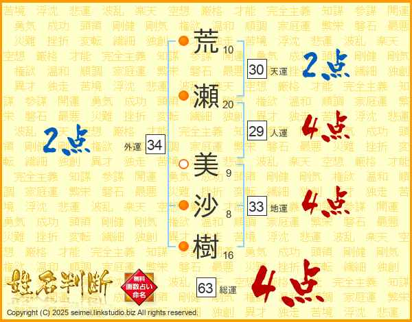 荒(10画)瀬(20画) 美(9画)沙(8画)樹(16画)