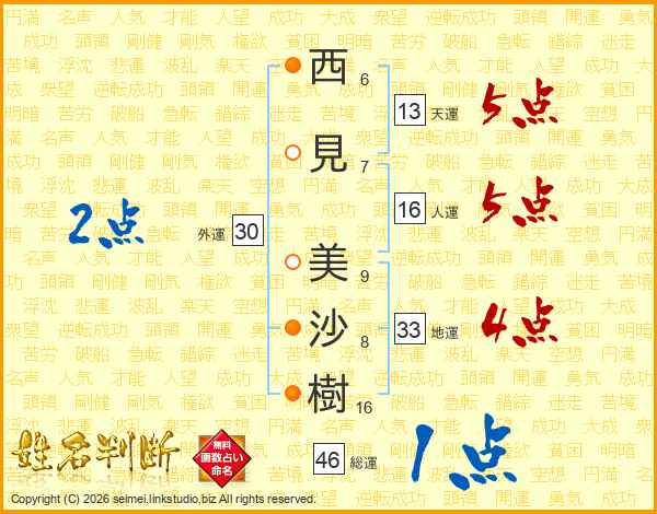 西(6画)見(7画) 美(9画)沙(8画)樹(16画)