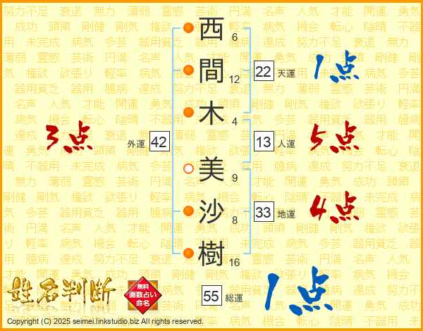 西(6画)間(12画)木(4画) 美(9画)沙(8画)樹(16画)