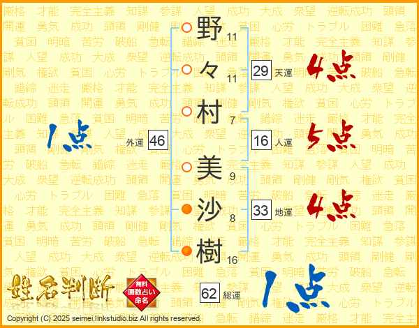 野(11画)々(11画)村(7画) 美(9画)沙(8画)樹(16画)