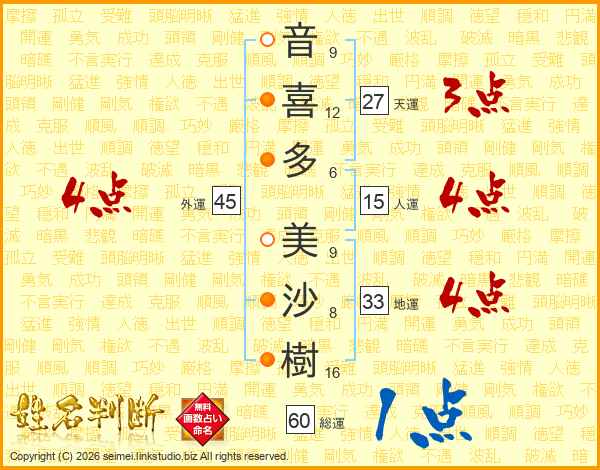 音(9画)喜(12画)多(6画) 美(9画)沙(8画)樹(16画)